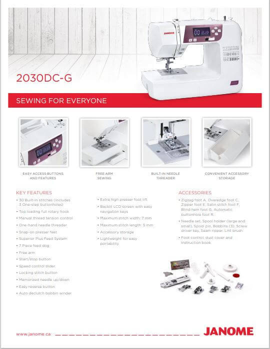 Well-equipped and intuitively designed for the home sewing enthusiasts. Indispensable for everyday sewing, the Janome 2030DC-G brings together all the vital features you need for home dec, garment sewing or scrapbooking projects. Built on a solid metal frame the computerized 2030DC-G includes: 30 stitches, 3 one-step buttonholes, free arm, easy access control buttons, lock stitch function, reverse and speed control slider.