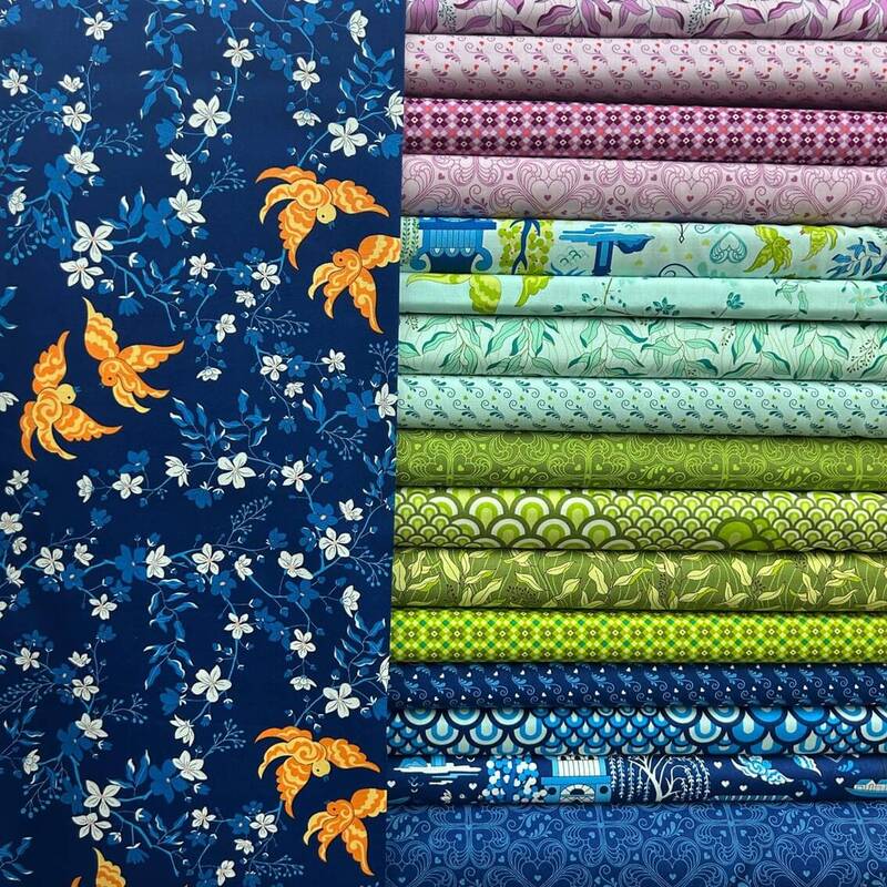 Say hello to “Legendary Love” by Sarah Thomas of Sariditty for Moda fabrics.! This collection is a whimsical tribute to the well- known, idyllic Blue Willow pattern often seen on china and linens. The legend behind this pattern involves two star-crossed lovers forbidden to be together by her father. Once the two eloped and ran away to be together forever, her father quickly pursued them to keep them apart— when the gods intervened and transformed the couple into lovebirds so they could fly away to live happily ever after. While most Blue Willow is often blue and white, Sarah also wanted to include unexpected hues of olive, lilac, and jade with pops of golden topaz and coral for an eclectic collection with many sophisticated and chic combinations.