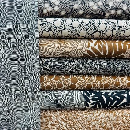 “Rhythm and Leaves" is a beautiful collection by freelance designer Cecilia Petterson based in Sweden for FIGO fabrics. The collection features intricate, monochromatic motifs on a beautiful linen/cotton blend, inspired by the growth, movement, and natural rhythm of the world. The fabrics are available in various patterns, such as Large Floral, Black Trellis, and Wheat.