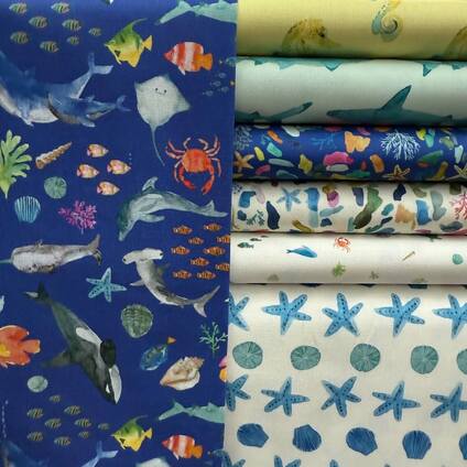The “Under the Sea” collection from Wee Blue Bell is a beautiful homage to the wonder of nature in our beautiful oceans, created in the brand’s classic, joyful style. Painted in intricate watercolour detail, the designs are full of interesting aquatic creatures and treasures. Beautiful shoals of colourful fish, pretty seahorses and friendly sharks swim across the fabrics. Fun, joyful colours make the designs fresh and very useable. Ideal for a multitude of craft projects from quilting to interiors, products and toys.